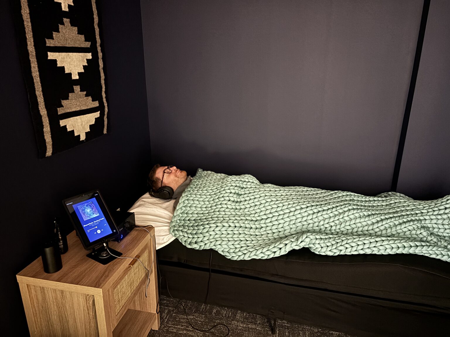 Each session lasts about 20-30 minutes. During this time, you will lie on a specialized sound bed in a quiet room, lay under a weighted blanket and wear headphones playing soundtracks that have been tailored to your specific needs.